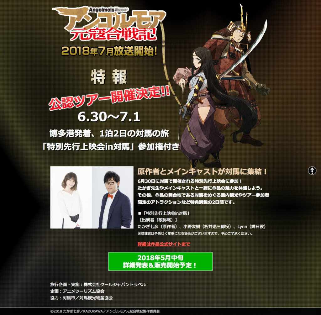 2018年7月からアニメ化作品がテレビで放映される人気歴史コミック「アンゴルモア元寇合戦記」の公認ツアーが、6月30日(土)から7月1日(日)に開催される。