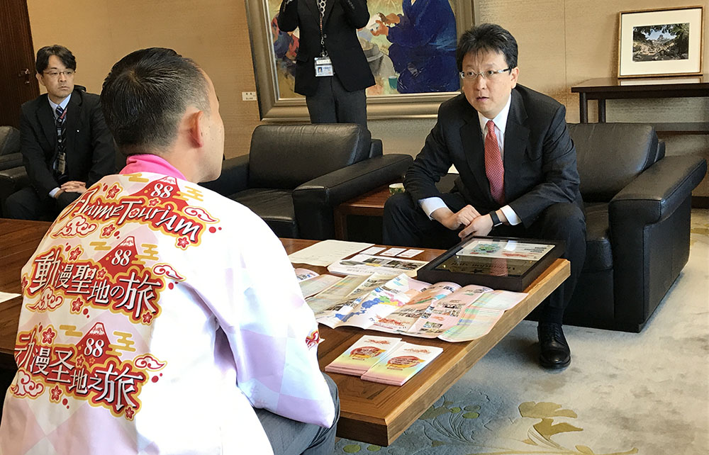当協会の森好文事務局長(写真内手前)が熊本市役所を訪問し、大西一史市長(写真内右奥)に”アニメ聖地認定プレート”を贈呈。アニメツーリズムに関するディスカッションも行なった