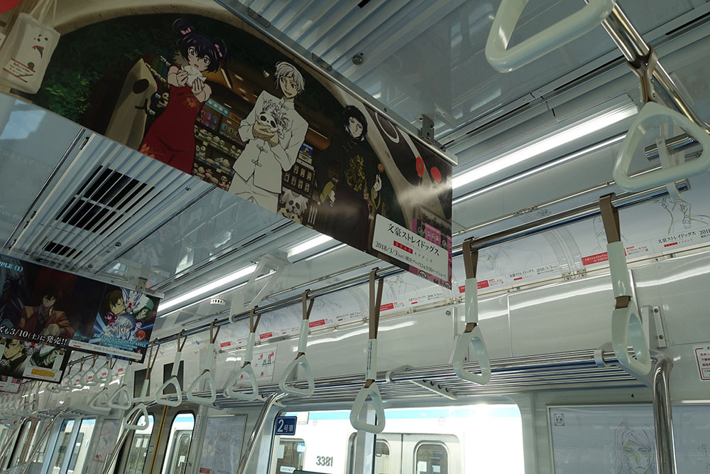 市営地下鉄ブルーラインには、1編成まるごと「文豪ストレイドッグス」の装飾をした「文豪ストレイドッグス ギャラリートレイン」(3月5日(月)まで)が登場。車内では、映画「文豪ストレイドッグス DEAD APPLE(デッドアップル)」の複製原画47種類や、描き下ろしイラストなどの展示も行う。