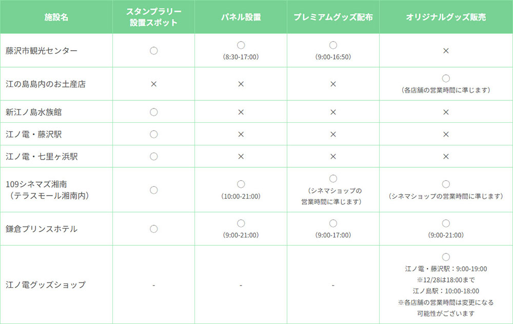 スタンプの設置場所は6カ所。そのうち4カ所のスタンプを集めると、スタンプラリー賞としてオリジナルカードを入手できる。またその他にも等身大パネルの設置やオリジナルグッズの販売も行われる。ここでしか手に入らないプレミアムグッズをGETして、作品の舞台を楽しもう。
