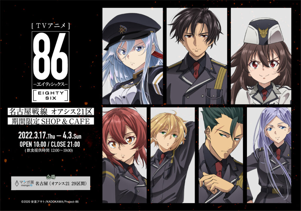 シリーズ累計発行部数が160万部を突破した安里アサトによるエンタメノベルを原作にしたテレビアニメ「86―エイティシックス―」。テレビアニメ放送開始からまもなく1周年を迎える本作の期間限定ショップ&カフェ「『TVアニメ「86―エイティシックス―」』期間限定SHOP&CAFE」が3月17日(木)~4月3日(日)まで、マンガ展 名古屋にて期間限定でオープン。