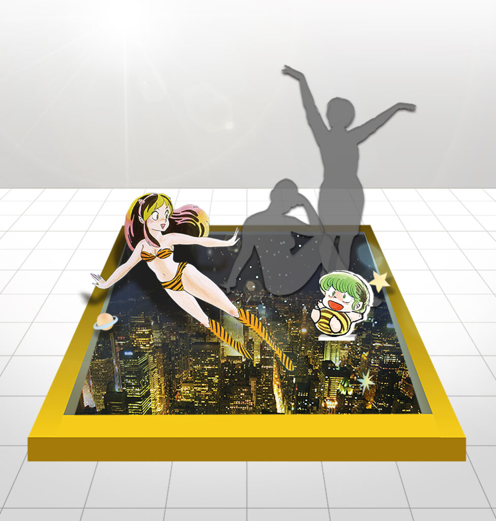 また会場には、ラムちゃんの等身大フィギュアや、名シーンを拡大したパネル展示などもお目見え。さらに、ARアプリやトリックアートを使ったフォトスポットでは、ラムちゃんと空中散歩をしているような、不思議な写真を撮影することができる。