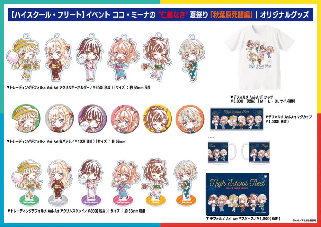 まず注目したいのは、夏らしい浴衣姿のキャラクターたちがデザインされたオリジナルグッズ。トレーディングデフォルメ Ani-Art アクリルキーホルダー(1個702円)やデフォルメ Ani-Art Tシャツ(4104円)など、バラエティに富んだアイテムが勢ぞろいする。また期間中は、商品を1000円以上(税別)購入するとカード型カレンダー(全6種、なくなり次第終了)がプレゼントされるなど、ファンにはうれしい特典も行われる。