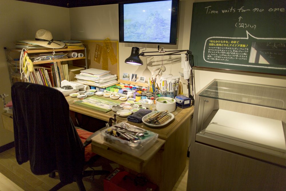 山本氏の描いたアニメーションの背景画や、五島市の美しい風景を描いた絵画などを約100点紹介。作品は、同館が1863年に建てられた武家屋敷「松園邸」を改修した建物という理由から、その雰囲気に合うよう屏風型のパネルに展示されている。また、アトリエを再現した展示室では、山本氏が作画する様子をモニターで上映するなど、ファン必見の展示が満載だ。