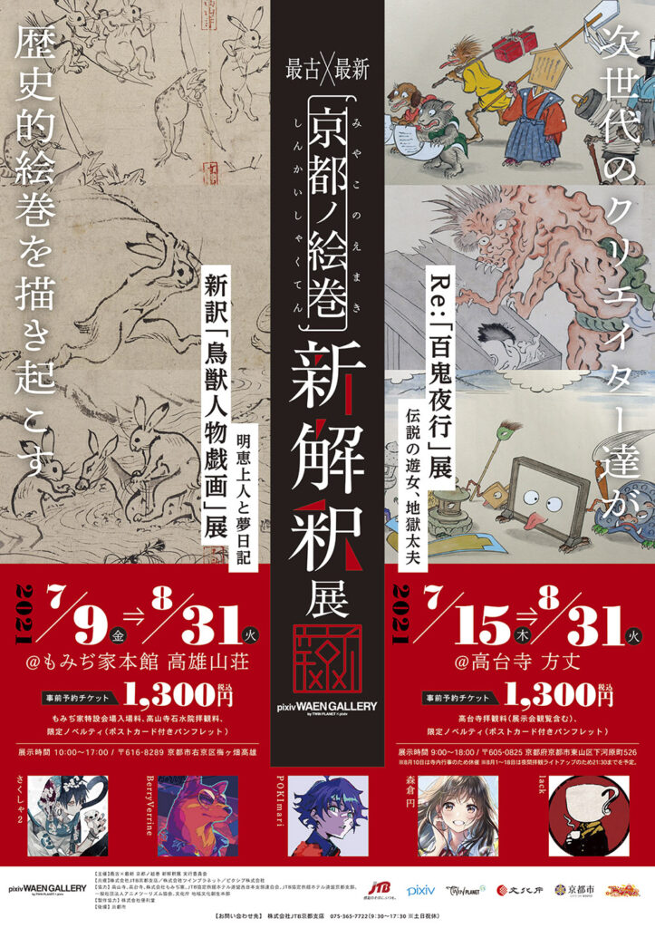 京都の文化財として名高い「鳥獣人物戯画」と「百鬼夜行」を現代の人気イラストレーターが新たな解釈を加え表現する企画展「最古×最新 京都ノ絵巻 新解釈展(みやこのえまき しんかいしゃくてん)」が、2021年7月9日(金)から京都府京都市で開催される。