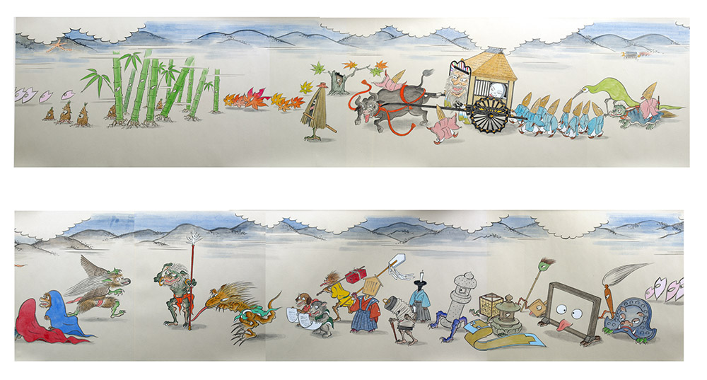 現代のイラストレーター・田中陽一郎氏が高台寺開創400年を記念して手がけた「高台寺百鬼夜行絵巻」も展示