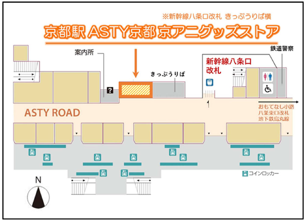 ショップ名は「京都駅 ASTY京都 京アニグッズストア」。場所は京都駅八条口の商業施設「ASTY京都内で、東海道新幹線京都駅1階「新幹線八条口改札」きっぷうりばの横の区画になる。