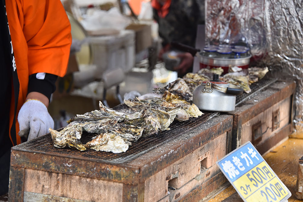 焼き牡蠣など、多彩なご当地グルメを扱う屋台が並ぶ