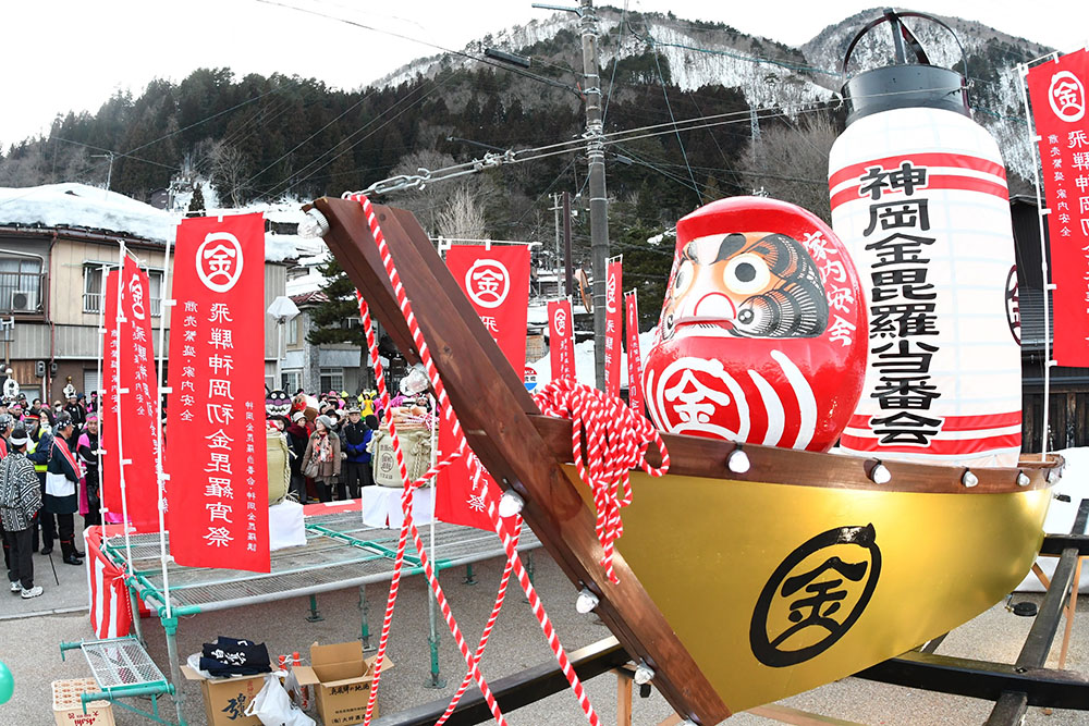 祭りに合わせて、見物客に“振る舞い”をしてくれる企画もめじろ押し。なかでも、注目したいのが3つのイベントだ。1つめは、ご当地グルメなどが貰えるスタンプラリー。所定の場所に置かれているスタンプを集めると、飛騨牛や商品券、とんちゃん用鉄板が当たるガラガラ抽選会にチャレンジできる。2つめは飛騨の銘酒が無料で飲める振る舞い酒。17:30に催される神輿と山車の出発式を皮切りに、行列が練り歩く道中の各所で日本酒が配布される。3つめは、祭りのフィナーレを飾る振る舞いまきもの。補陀山洞雲寺に設けられた特設ステージから、お菓子やトイレットペーパー、使い捨てカイロなどさまざまなアイテムが観客に向かって振る舞われる。