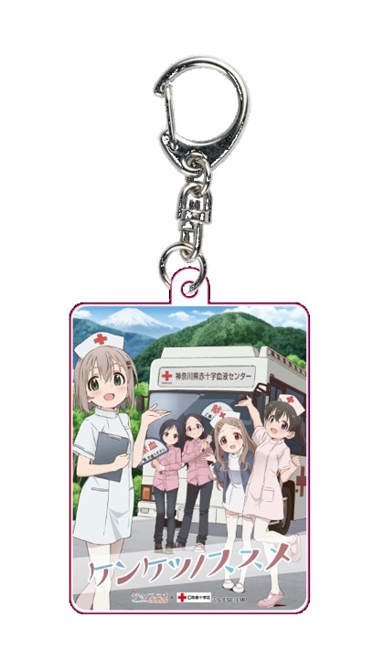 「描き下ろしアクリルキーホルダー」のデザインには、看護師の衣装を着用した主人公のあおいやひなたたちが登場。さらに、作品名をイメージした“ケンケツノススメ”というロゴがプリントされている。