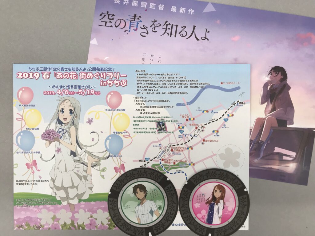 また、秩父を舞台にしたアニメ映画「空の青さを知る人よ」の公開を記念し、同じく秩父を舞台にしたアニメ「あの花」とコラボしたイベントを実施「2019 春『あの花』街めぐりラリーin ちちぶ~めんまと巡る言葉さがし~」と題し、5月19日まで開催している。