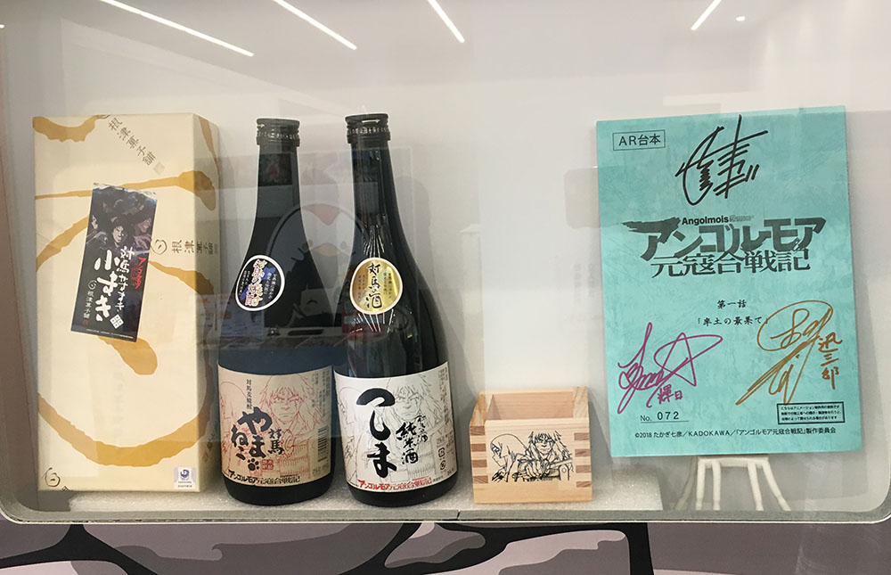 サイン入りアフレコ台本に加えて、作品と地元産品のコラボ商品も展示