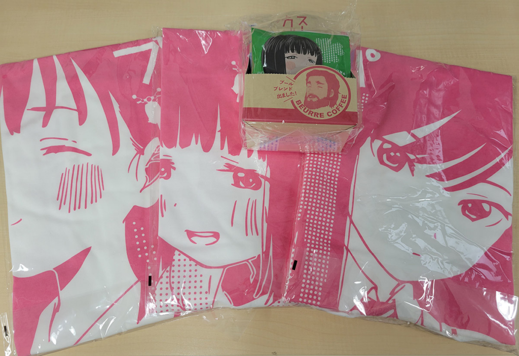 作品のキャラクター・小熊、礼子、椎のTシャツ(各5800円)や、椎の家族が営むカフェのコーヒーをイメージした「スーパーカブ BEURRE COFFEE」(2500円)などに加え、「耐水ステッカー 北杜市八ヶ岳ver」(全3種、各880円)など以前のイベントでも好評だったグッズを各種販売します。また、「山梨シャインマスカット ラングドシャ」(600円)や「甲州ワインビーフ カシューナッツ」(450円)など、山梨県の名産品も販売します。