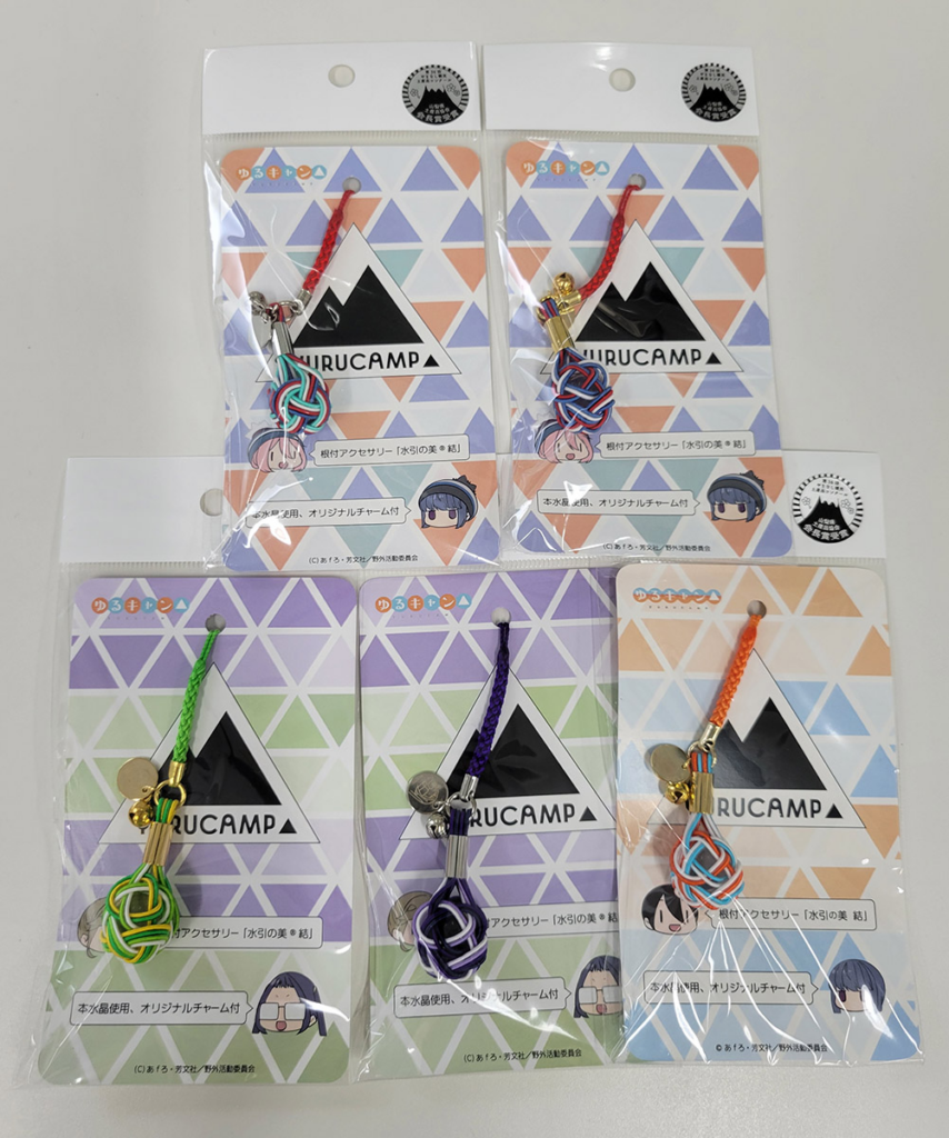 本水晶を日本の伝統工芸”水引結び”で包むように作られた根付ストラップの人気商品「水引の美 結」と作品がコラボした「水引の美結×ゆるキャン△ コラボ第2弾根付ストラップ」(各務原なでしこ ver.と志摩リン ver.など全5種、各1650円)を販売します。