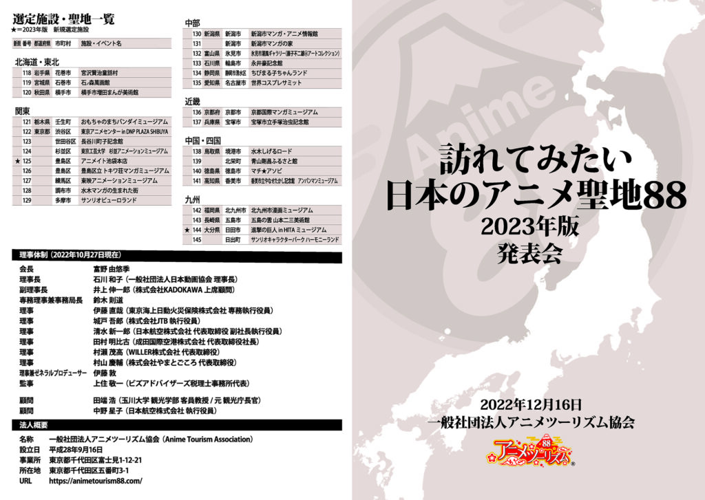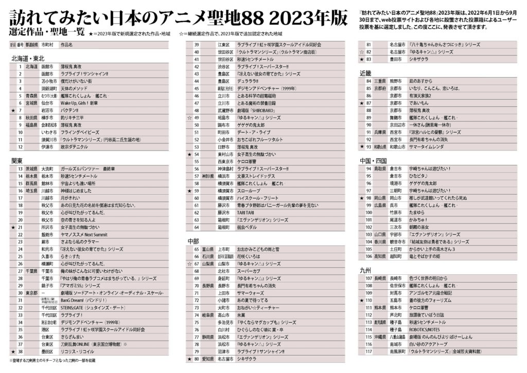 88作品、26施設、2イベント、117自治体が選定されました「訪れてみたい日本のアニメ聖地88」2023年版の結果に関しましては、以下URLにてリスト(発表会パンフレットPDF)を掲載しておりますので、是非ご覧ください。