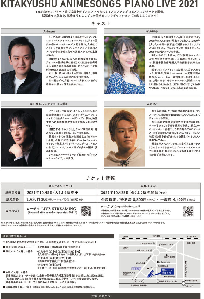 2021年11月28日(日)に福岡県北九州市で、YouTubeやコンサート等で活躍している人気ピアニストたちが集い人気のアニメソングを奏でる「北九州アニメソングピアノライブ 2021」が開催される。